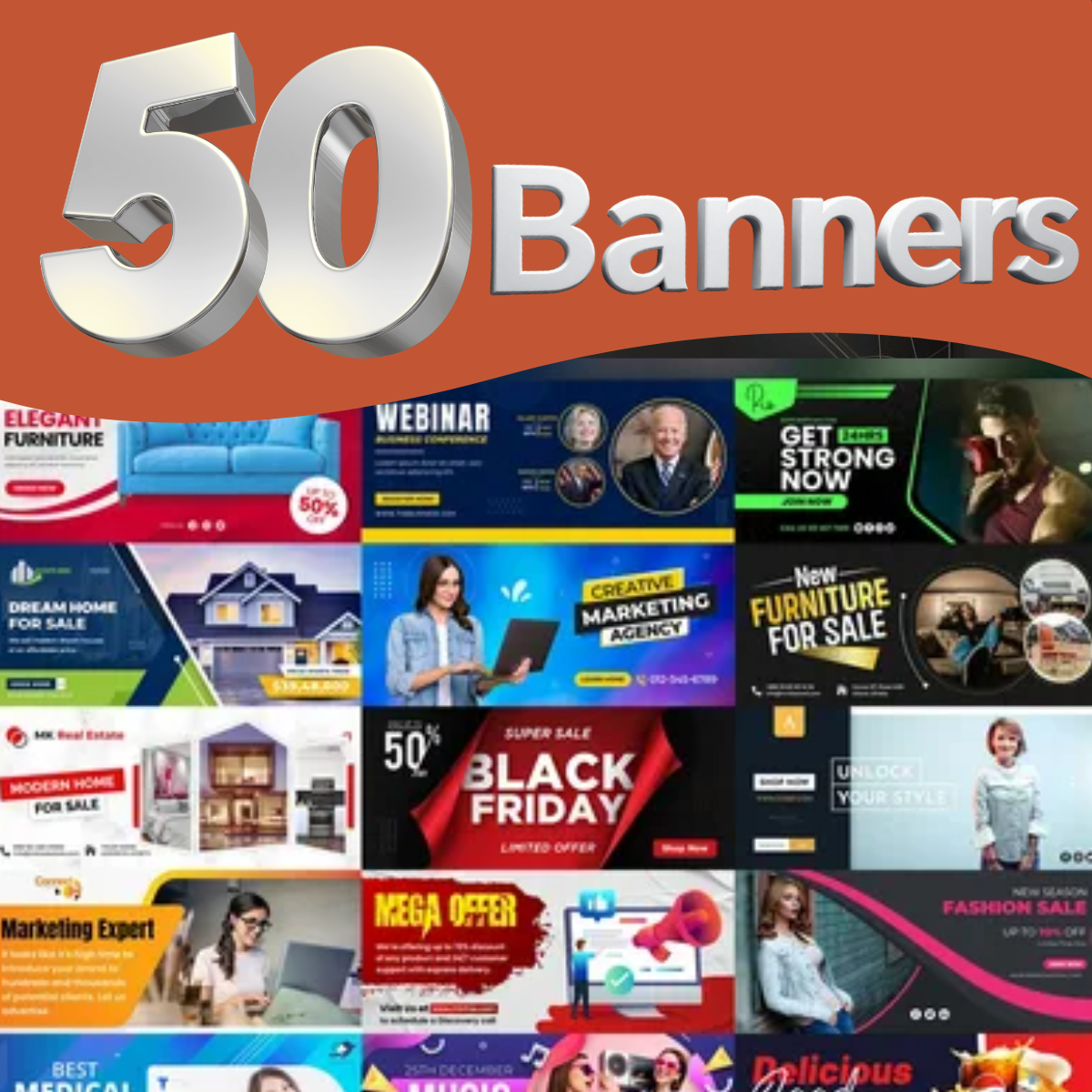 Upgrade your marketing visuals with 50 Banners, a high-quality banner design pack created for digital marketers, graphic designers, business owners, and social media managers. This powerful bundle includes 50 professionally designed banners that can be used for websites, advertisements, promotions, social media campaigns, and online stores.