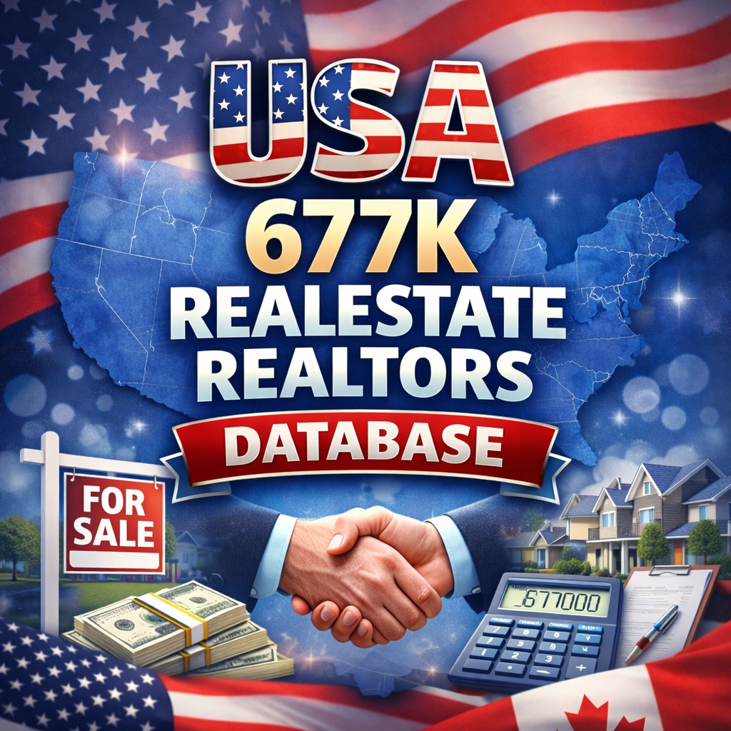 Access a massive and verified database of 677,000 real estate agents and realtors across the United States. Perfect for real estate marketers, mortgage brokers, property developers, home service providers, and B2B professionals, this database provides accurate and up-to-date contacts to boost outreach and business opportunities.